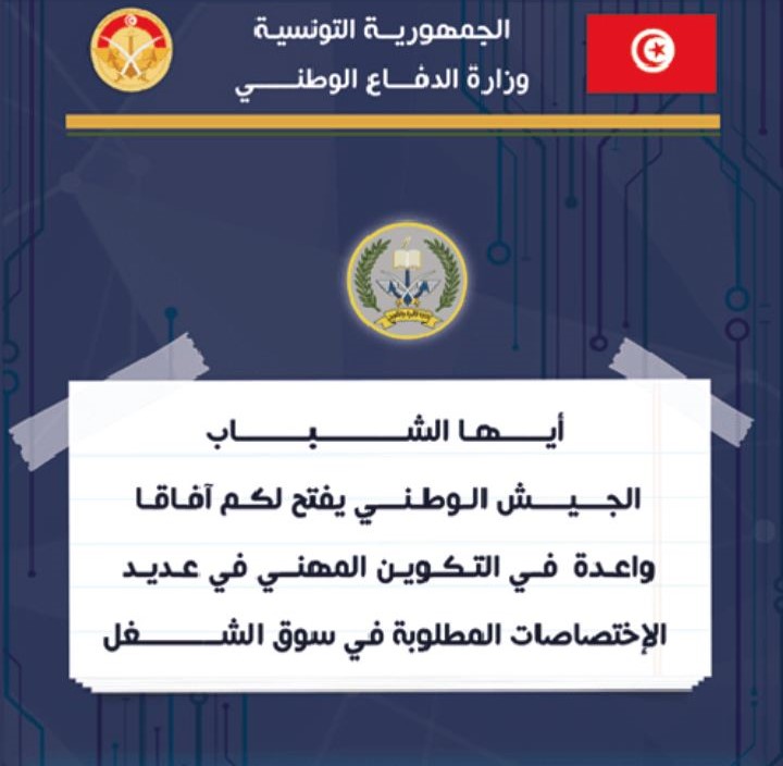 تعلم وزارة الدفاع الوطني كافة المترشّحين الراغبين في الالتحاق بالمراكز العسكرية للتكوين المهني، أن باب التسجيل عن بعد ينطلق يوم الخميس 16 أكتوبر 2025 عبر الموقع الرسمي للوزارة.