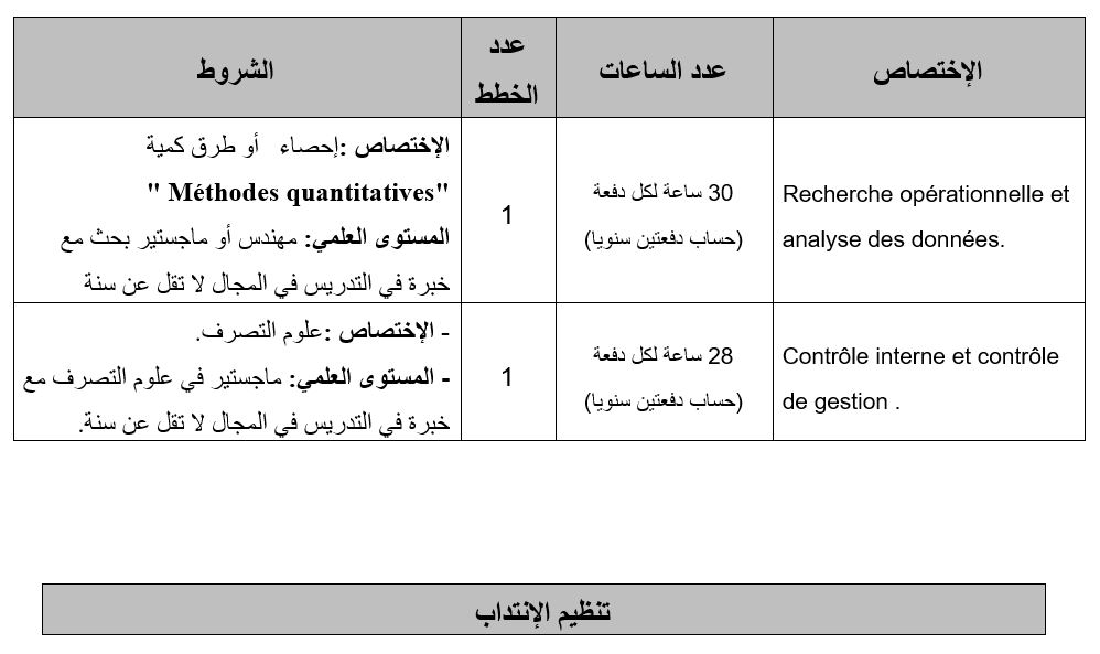 تعتزم مدرسة الأركان فتح باب الترشح لتدريس ساعات عرضية بعنـوان السـنة التكوينية 2025-2026 عن طريق دراسة الملفات ومقابلة شفاهية مع المترشحين، وذلك قصد سد الشغور في المواد المبينة بالجدول أدناه، وفقا للشّروط المضمّنة به: