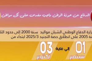 تعلـم وزارة الـدفـاع الـوطني الشبّان مواليد الثلاثية الثالثة من سنة 2005 ومواليد السنوات السابقة إلى حدود سنة 2000، الذين لم يقوموا بتسوية وضعياتهم إزاء قانون…